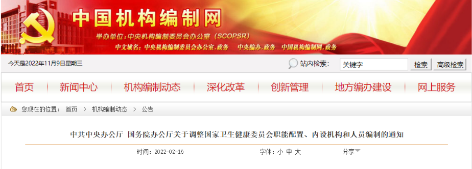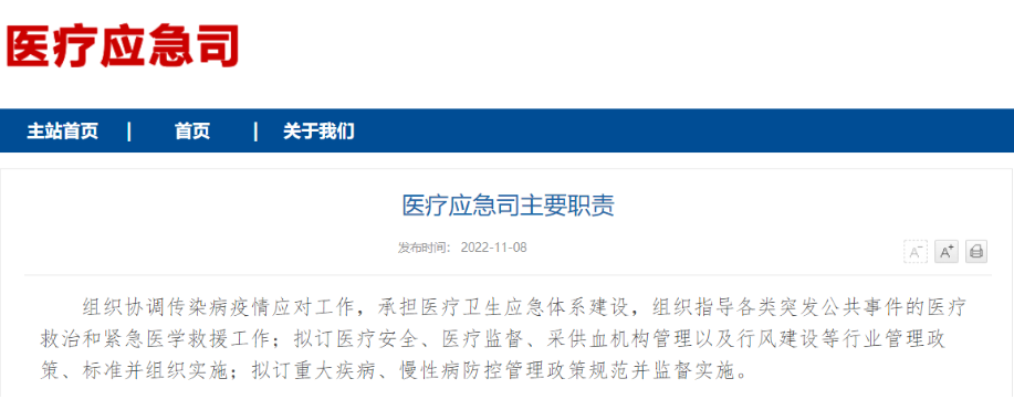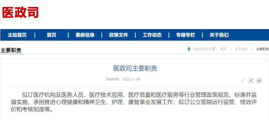 11月8日,国家卫生健康委员会对内设机构调整在官网上正式做出更新,其中显示,医政医管局已更名为医政司,卫生应急办公室更名为医疗应急司,机关党委更名为机关党委(党组巡视工作领导小组办公室)。