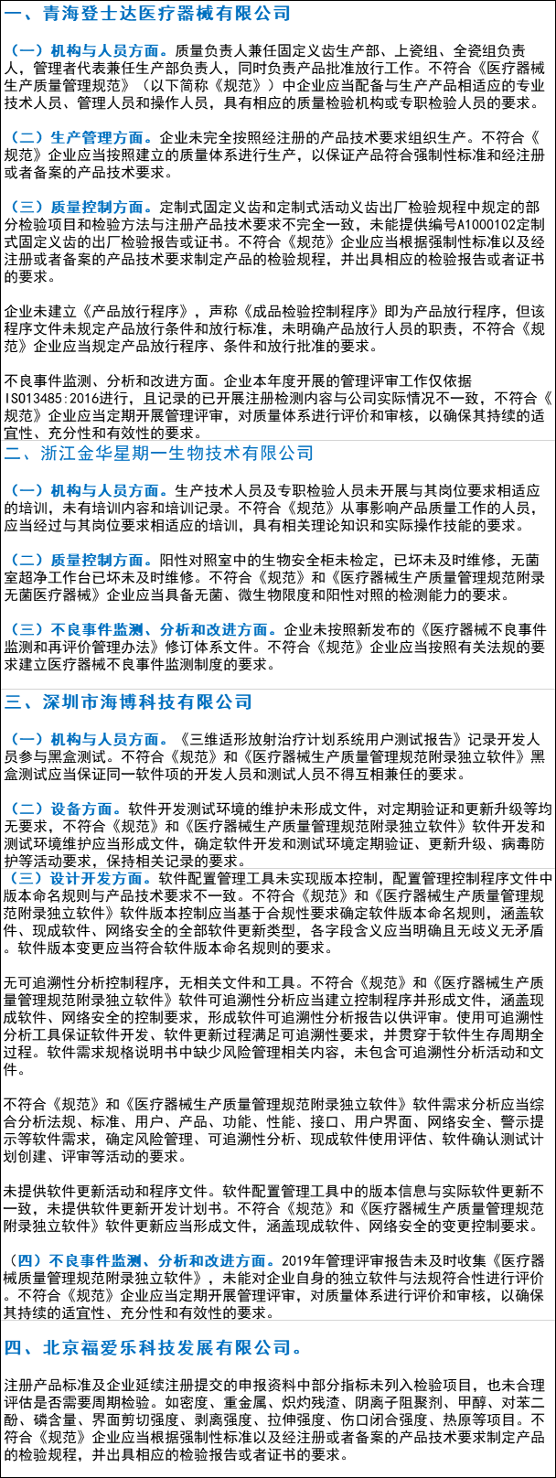 青海登士达医疗器械有限公司、浙江金华星期一生物技术有限公司、深圳市海博科技有限公司、北京福爱乐科技发展有限公司,4家企业因质量管理体系存在严重缺陷,不符合医疗器械生产质量管理规范相关规定,国家药监局已经责令上述企业立即停产整改。