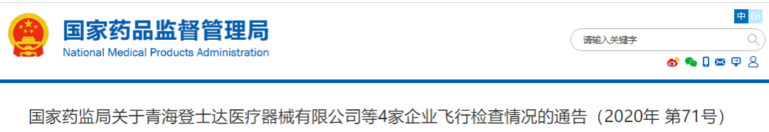 10月20日,国家药监局发布《关于青海登士达医疗器械有限公司等4家企业飞行检查情况的通告(2020年 第71号)》。